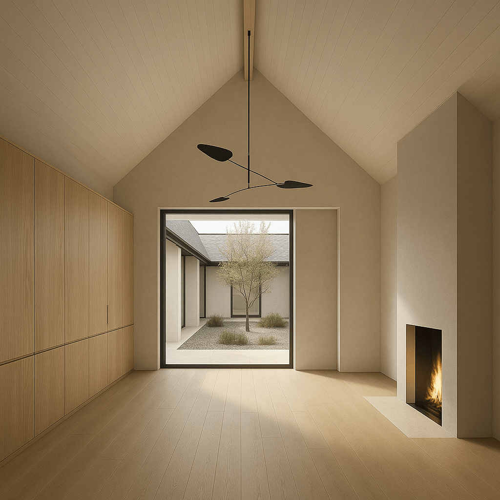 A warm, minimal interior direction exploring proportion, material calm and a quiet architectural presence. Centred around a soft courtyard core, the work refines our warm-neutral palette of oak, stone and sculptural light — forming the foundation of 04/05 Architecture’s residential design language.